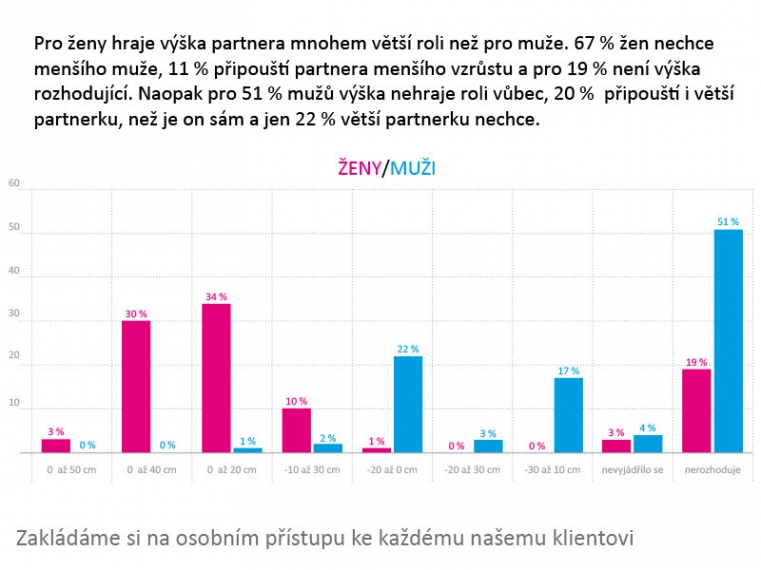 Takových zajímavostí bylo víc, ale v začátcích jsme nikdy mužům nedoporučovali ženy, které byly vyšší než oni. Pak však z ankety na téma, jak by měl váš partner vypadat, vyplynulo, že s výškou své partnerky nemá valná většina mužů žádný problém. Každé ženy se teď ptáme, jestli je pro ni výška rozhodující, a pokud ne, propojujeme i nižší muže s vyššími ženami a fungujete to skvěle. Našeho posledního výzkumu v září 2015 se zúčastnilo přes 5 500 respondentů, takže výsledky lze skutečně považovat za relevantní. Jedna z otázek byla, jaký kus oblečení vás upoutá na opačném pohlaví jako první. A právě tímto výsledkem argumentuji ve svém programu Renesance ženství našim klientkám. Muži zařadili na první místo sukni. Kalhoty, do kterých se my ženy teď oblékáme nejčastěji, zařadili až daleko za ni. Ženskost je to, co v mužích probouzí emoce, a té bychom se měly my dámy držet. U žen naopak zvítězila košile. Chcete ji sbalit? Dopněte límeček a je to v kapse, říká zase s nadsázkou náš randeolog.